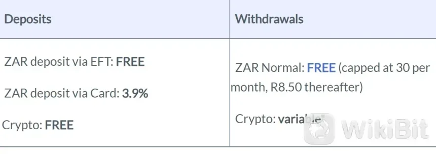 Para traders na África do Sul, os depósitos e saques possuem estruturas de taxas diferentes:
