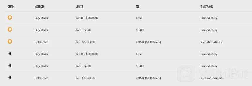 As taxas de negociação da MyBTC.ca são estruturadas com base no volume em CAD. As taxas de tomador variam de 0,50% a 0,10%, com taxas de fabricante correspondentes variando de 0,16% a 0,02%. Para compra e venda, os detalhes das taxas são os seguintes: Ordens de compra de $500 a $500.000 não têm taxa e são imediatas. Ordens de compra de $20 a $500 têm uma taxa de $5,00 e são imediatas. Ordens de venda de $5 a $100.000 têm uma taxa de 4,95% (mínimo de $1,00) e requerem 2 ou 12 confirmações, dependendo do tipo de ordem.