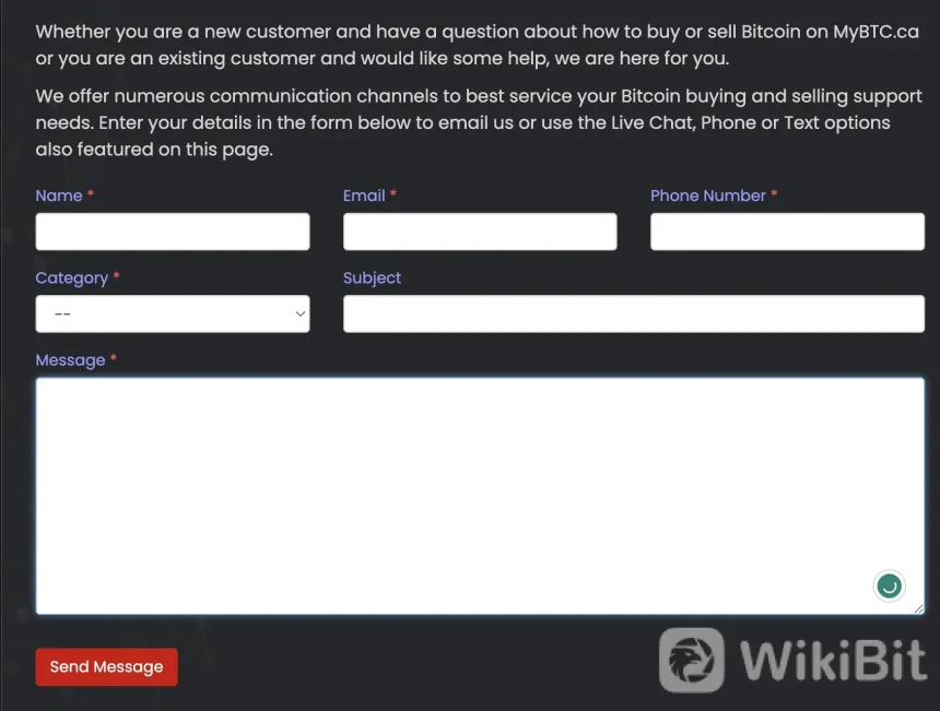 MyBTC.ca oferece suporte ao cliente acessível tanto para novos quanto para clientes existentes. Eles fornecem vários canais de comunicação, incluindo e-mail, chat ao vivo, telefone (647-875-6717) e opções de mensagem de texto. Os clientes também podem entrar em contato por meio do formulário de contato fornecido. Além disso, um endereço de correspondência está disponível em 206-260 Adelaide St. E, Toronto, ON, M5A1N1, embora seja importante observar que este endereço não está operacional para negócios ou presença de funcionários devido à sua natureza online.