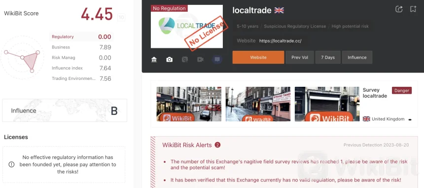 A Localtrade não é regulamentada, o que significa que opera sem supervisão formal ou diretrizes de qualquer autoridade reguladora. Essa falta de regulamentação pode potencialmente expor os usuários a riscos relacionados à segurança, transparência e proteção financeira.