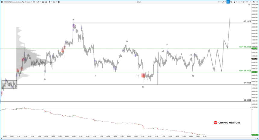Таким образом, ожидаем продолжения ротации в рамках диапазона (как показано на графике) с выходом наверх и преодолением $67 150. Первой целью по методике объемного анализа станет диапазон $80 000-$85 000.