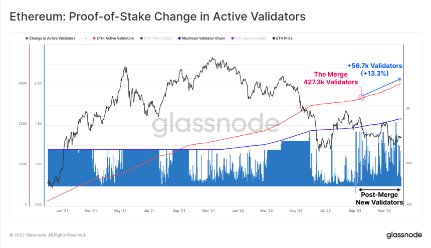 В сети Ethereum с момента The Merge число активных валидаторов выросло на 13,3%, до 484 000. Количество заблокированных в стейкинге в Beacon Chain ETH возросло до 15,618 млн ETH, что эквивалентно 12,89% предложения.