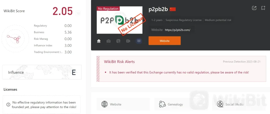 P2Pb2b не предоставляет информацию о каком-либо регулирующем органе, контролирующем его деятельность. Недостатком работы на нерегулируемой бирже является отсутствие надзора и ответственности, которые сопутствуют регулированию. Это означает, что нет гарантии соответствия платформы стандартам и правилам отрасли, и пользователи могут находиться в большем риске мошенничества или других недобросовестных практик.