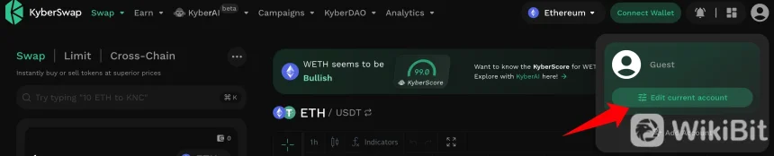 1. Посетите веб-сайт KyberSwap и нажмите кнопку"Редактировать текущий аккаунт".