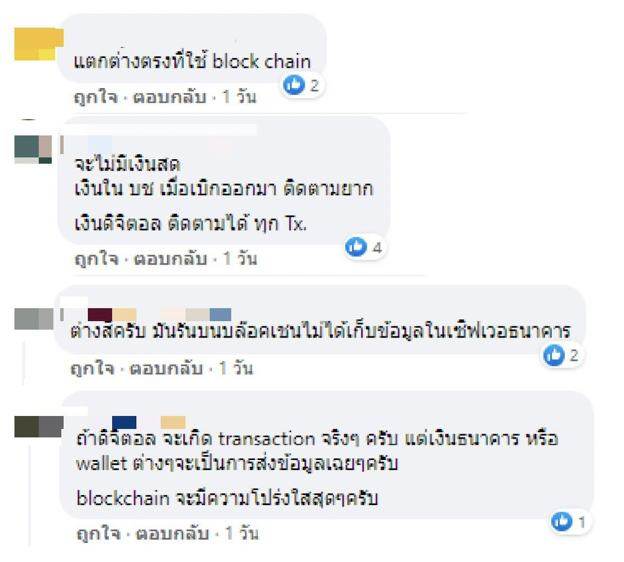 ต่อมาเรามาดูความคิดเห็นของนักลงทุนที่เข้ามาตอบคำถามใต้โพสต์นี้กันดีกว่า โดยส่วนใหญ่นั้นตอบว่า ต่างกันที่ ‘เงินบาทดิจิทัล’ ทำงานบน ‘Blockchain’ ไม่ได้อยู่บนเซิร์ฟเวอร์ของธนาคารอย่าง ‘เงินอิเล็กทรอนิกส์’ แถมข้อมูลการทำธุรกรรมยังสามารถตรวจสอบ ซึ่งต่างจากอีกเจ้าที่ยากต่อการตรวจสอบนั้นเอง