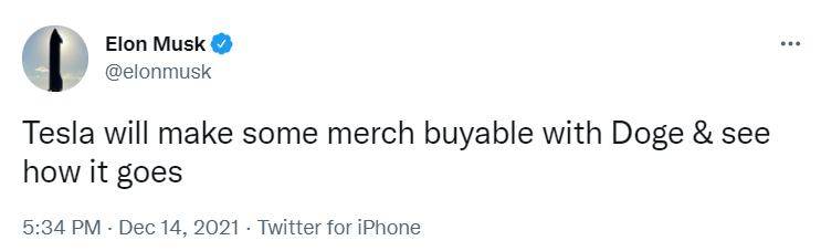 “เทสลาจะอนุญาตให้ลูกค้าสามารถซื้อสินค้าบางรายการด้วย Dogecoin และเราจะดูว่าเป็นอย่างไร” นายมัสก์กล่าว