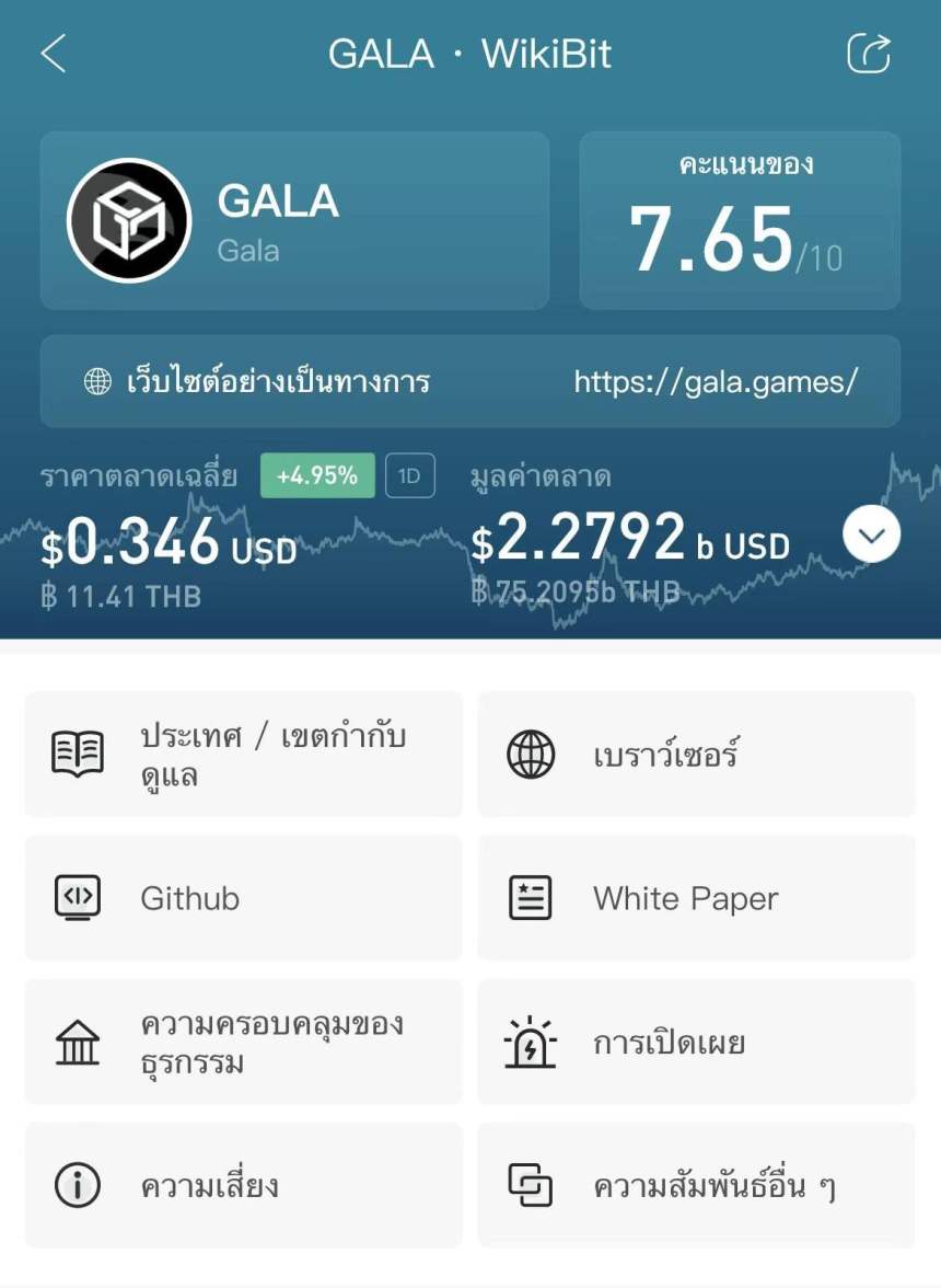 แอปพลิเคชัน WikiBit เป็นแอปตรวจสอบข้อมูลเหรียญคริปโต ซึ่งเหรียญ Gala ได้คะแนนความน่าเชื่อถือสูงถึง 7.65 / 10 คะแนน และมูลค่าการซื้อขายใน 24 ชม.ที่ผ่านมาสูงถึง 2.4 พันล้านบาท บ่งบอกถึงความฮอตฮิตของเหรียญนี้อย่างมาก ถ้าคุณอยากอ่าน White paper ฟรีของเหรียญ Gala สามารถดูได้ผ่านแอปพลิเคชัน WikiBit ได้เลย