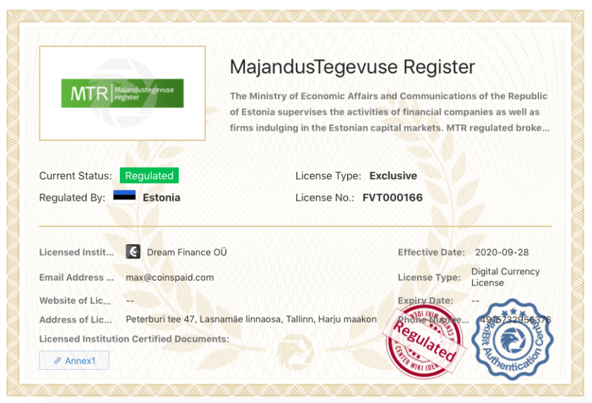- ควบคุมโดย เอ็มทีอาร์: : สิ่งนี้ทำให้มั่นใจได้ว่า CoinsPaid ดำเนินการภายใต้กรอบกฎหมายและเป็นไปตามมาตรฐานบางประการ ทำให้ผู้ใช้มีความอุ่นใจ