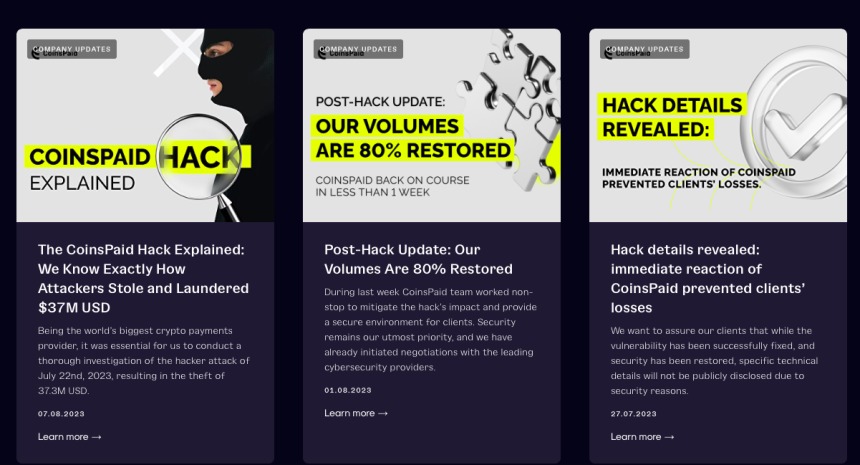 CoinsPaidเป็นแพลตฟอร์มแลกเปลี่ยนสกุลเงินเสมือนจริงที่ก่อตั้งขึ้นในปี 2014 และตั้งอยู่ในสหราชอาณาจักร มันถูกควบคุมโดย เอ็มทีอาร์เพื่อให้มั่นใจว่าเป็นไปตามมาตรฐานที่กำหนดและดำเนินการภายในกรอบกฎหมาย แพลตฟอร์มดังกล่าวนำเสนอสกุลเงินดิจิทัลที่หลากหลาย โดยมีตัวเลือกให้ผู้ใช้ซื้อขายมากกว่า 20 รายการ CoinsPaid ให้การสนับสนุนแชทสดและอีเมลตลอด 24 ชั่วโมงทุกวันสำหรับผู้ใช้ เพื่อให้มั่นใจว่าลูกค้าสามารถขอความช่วยเหลือหรือแก้ไขปัญหาใด ๆ ที่อาจพบได้ตลอดเวลา