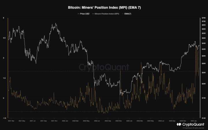 ในขณะนี้ ตัวชี้วัด MPI แสดงค่าที่สูงผิดปกติ ซึ่งบ่งบอกว่านักขุดได้ขายเหรียญของตนเป็นชิ้นสำคัญ หากแนวโน้มนี้ดำเนินต่อไป ราคาก็มีแนวโน้มที่จะกลับตัวเป็นขาลงอันเป็นผลมาจากแรงกดดันในการขายที่มากเกินไป