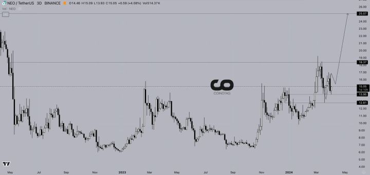 นักลงทุนที่เข้าสู่ตำแหน่งซื้อในเหรียญ NEO จากช่วงดังกล่าวสามารถตั้งเป้าหมายไว้ที่ 25 เหรียญสหรัฐฯ โดยมีจุดหยุดขาดทุนที่ตั้งไว้ที่ระดับเริ่มต้นที่ 17.25 เหรียญสหรัฐฯ หลังจากทำกำไรแล้ว