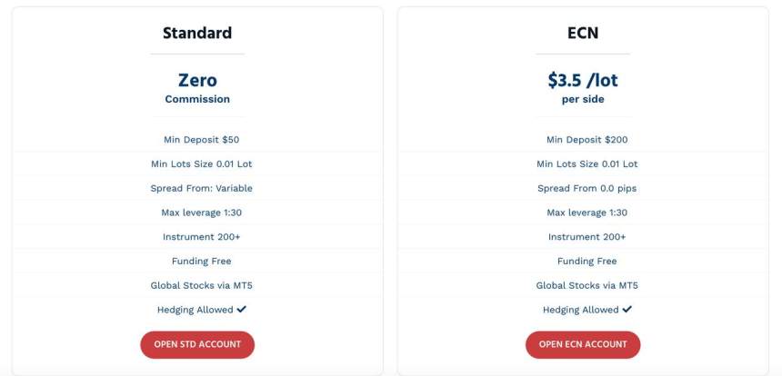 ด้วยการฝากเงินขั้นต่ำที่ต่ำ ($50 สำหรับบัญชีมาตรฐาน, $200 สำหรับบัญชี ECN) และไม่มีค่าคอมมิชชั่นสำหรับบัญชีมาตรฐาน บริษัทนี้บริการสำหรับนักเทรดทุกระดับ อย่างไรก็ตาม สถานะที่ไม่ได้รับการกำกับดูแลของบริษัทนี้เป็นปัญหาที่อาจเกิดความเสี่ยง และค่าคอมมิชชั่นสูงสำหรับบัญชี ECN ($3.5/ล็อตต่อด้าน) ส่งผลกระทบต่อค่าธรรมเนียมการซื้อขาย