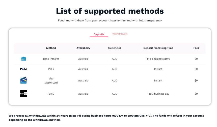 | Deposit & Withdrawal | โอนเงินผ่านธนาคาร, POLi, วีซ่า/มาสเตอร์การ์ด, PayID |