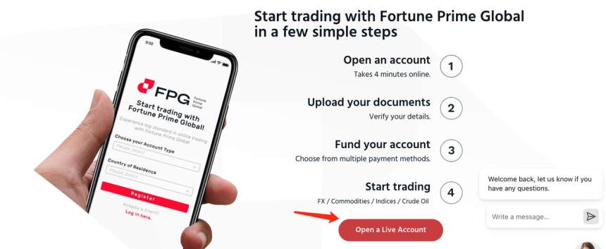 เข้าชมเว็บไซต์ Fortune Prime Global และไปยังหน้าสร้างบัญชี กรอกข้อมูลที่จำเป็นเพื่อลงทะเบียนบัญชี ให้แน่ใจว่าคุณให้ข้อมูลที่ถูกต้องและทำขั้นตอนการยืนยันที่จำเป็นโดยแพลตฟอร์ม