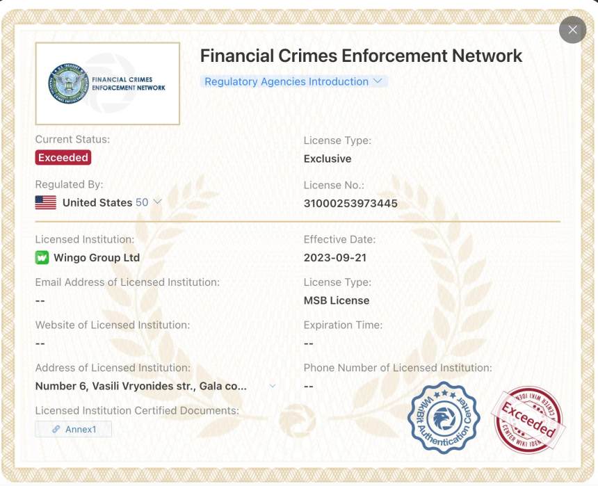WINGO ได้รับการควบคุมโดย Financial Crimes Enforcement Network (FinCEN) ในสหรัฐอเมริกา และได้รับใบอนุญาตเฉพาะ