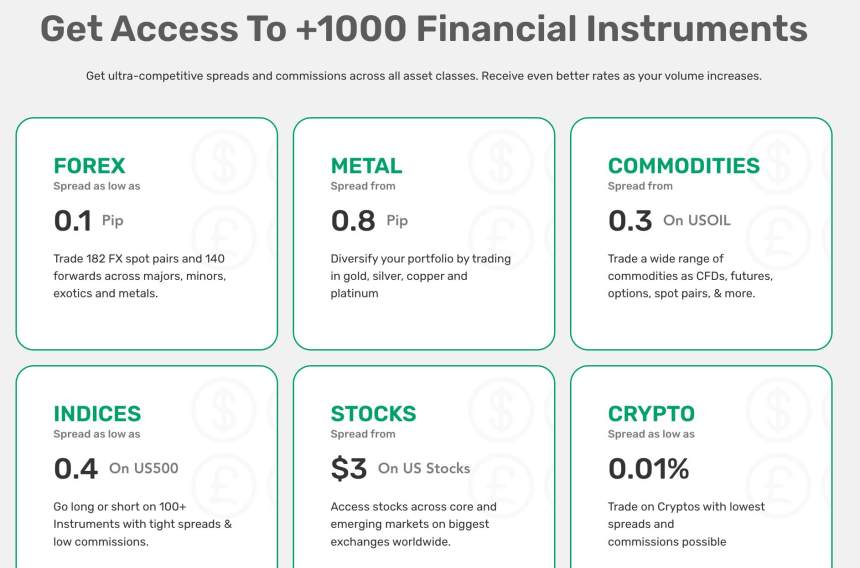 สินค้าโภคภัณฑ์ มีการกระจายที่เริ่มต้นที่ 0.3 สำหรับ USOIL ดัชนีเช่น US500 มีการกระจายที่ต่ำเพียง 0.4 และการซื้อขายหุ้นเริ่มต้นที่ $3 ต่อการซื้อขายในหุ้นสหรัฐ