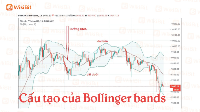 Chỉ báo Bollinger Bands là sự kết hợp giữa đường trung bình động Moving Average và độ lệch chuẩn, cấu trúc của nó gồm có 3 thành phần: