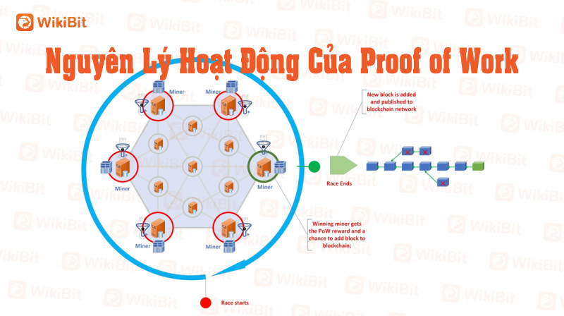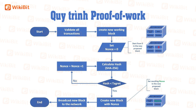 Proof Of Work (tiếng việt là Bằng chứng công việc, thường được gọi tắt là PoW) là một thuật toán đồng thuận của hầu hết các loại tiền điện tử. Trong Blockchain, thuật toán này được sử dụng để xác nhận các giao dịch và tạo ra các khối mới cho chuỗi. Với PoW, các thợ mỏ hoàn thành việc xác nhận các giao dịch trên mạng và được thưởng. Proof of Work là thuật toán đồng thuận đầu tiên xuất hiện. PoW vẫn là thuật toán được sử dụng hầu hết trên các đồng tiền điện tử. Proof Of Work được Satoshi Nakamoto giới thiệu trên WhitePaper của Bitcoin vào năm 2008. Tuy nhiên, khái niệm và công nghệ về PoW đã có từ trường đó rất lâu. Cơ chế hoạt động Proof Of Work (PoW) Cơ chế hoạt động của PoW tương đối đơn giản. Được hiểu ở đây là ghi lại các giao dịch vào sổ cái và xác nhận những giao dịch đấy.