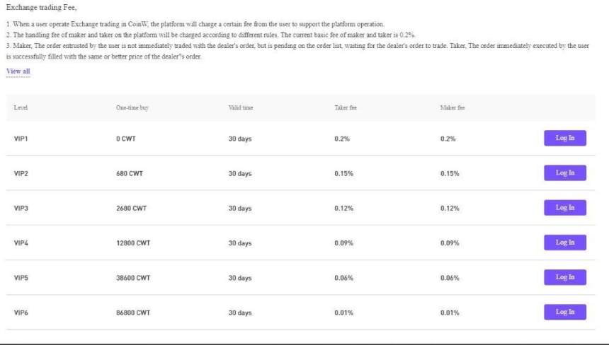 CoinW thu phí 0.2% cho cả người tạo lệnh và người thực hiện lệnh trên mỗi giao dịch.