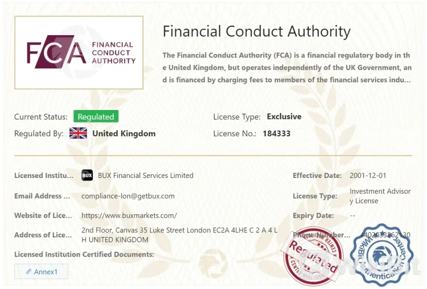 BUX được quy định bởi Cơ quan Hướng dẫn Tài chính (FCA). FCA quy định BUX dưới Giấy phép Tư vấn Đầu tư với Số quy định là 184333. Điều này cho thấy BUX được ủy quyền và quy định bởi FCA về dịch vụ tư vấn đầu tư.