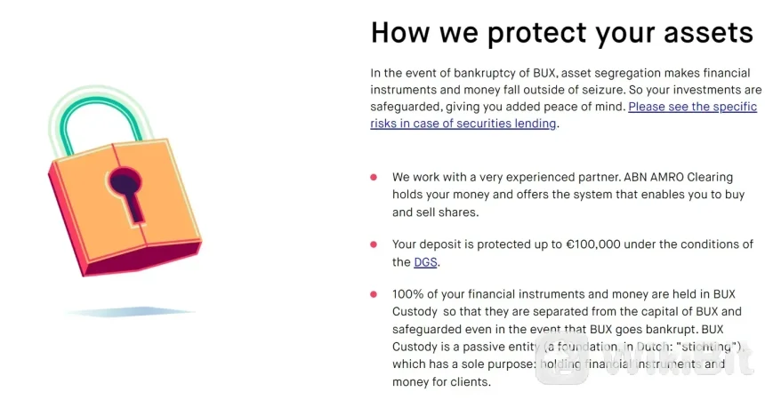Ngoài ra, BUX tuân thủ các quy định tốt nhất trong ngành khi lưu trữ và xử lý tài sản của người dùng. Sàn giao dịch giữ phần lớn tài sản của người dùng trong ví lạnh ngoại tuyến và không thể truy cập được bởi các hacker tiềm năng. Điều này giúp giảm thiểu nguy cơ mất cắp hoặc mất mát tài sản.