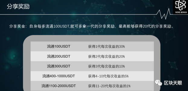 自身每多流通100USDT,就可多拿一代的分享奖励,最高能够获得20代的分享奖励。