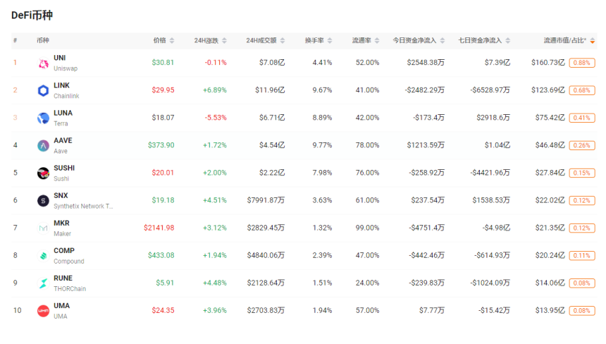 至截稿时止,主流DeFi通证当前市场概况如下,十大品种9涨1跌 唯独LUNA跌幅超5%: