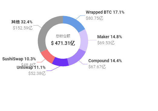 至截稿时止:全市场DeFi总锁仓额为471.31亿美元,具体分项占比如下: