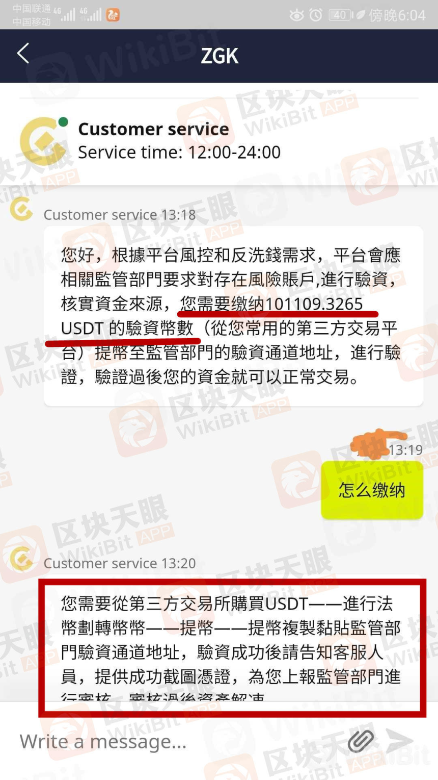 ZGK交易所客服要求在48小時內繼續充幣10萬多U 到他們提供的驗資通道進行驗資——驗資成功後,平臺上報給監管部門審核——審核通過後才解凍資產。