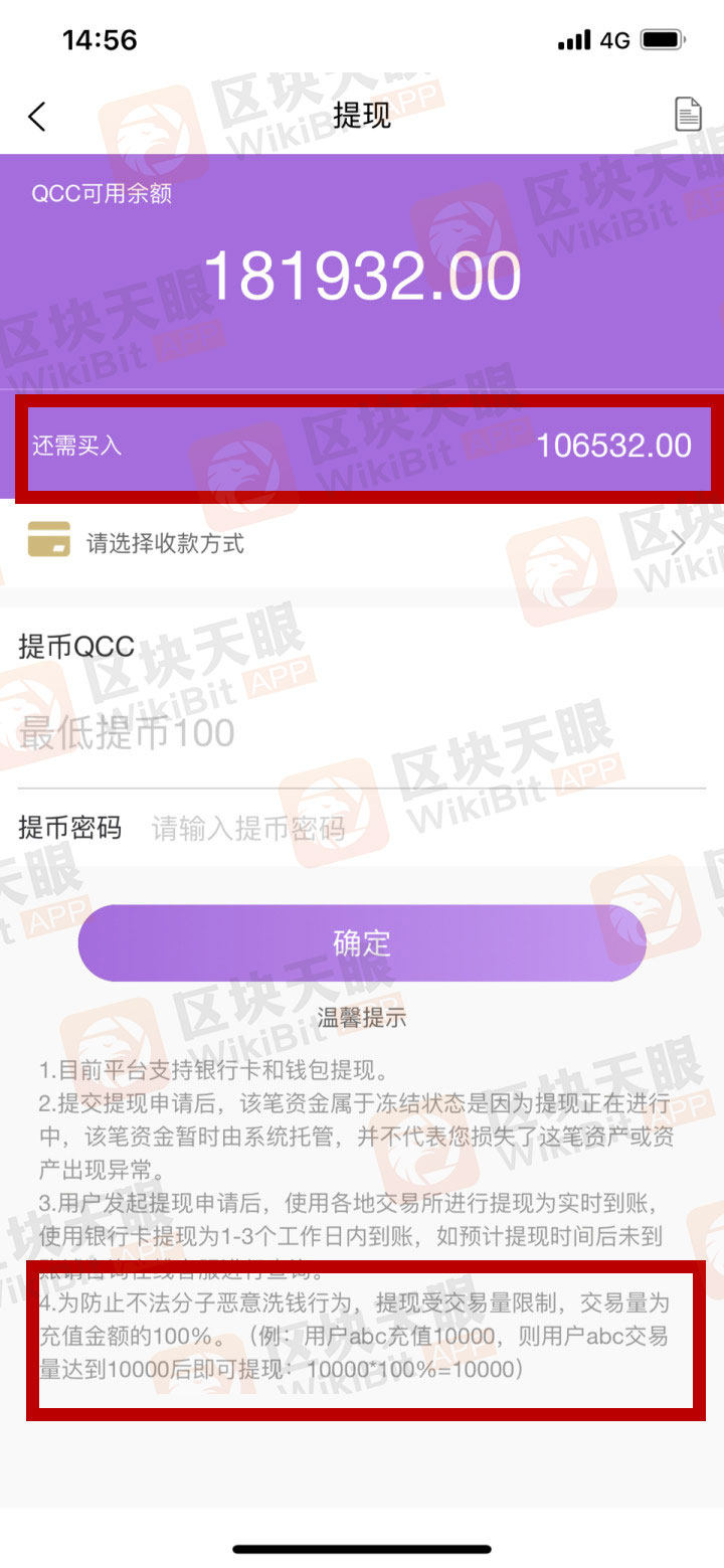 用户想把在鹿网交易所的币给提出来,但是显示还要再买10万多的币。再看看提现页面里的小字“温馨提示”:提现受交易量的限制,交易量为充值金额的100%,例如用户abc充值10000,则用户abc交易量达到10000后即可提现。