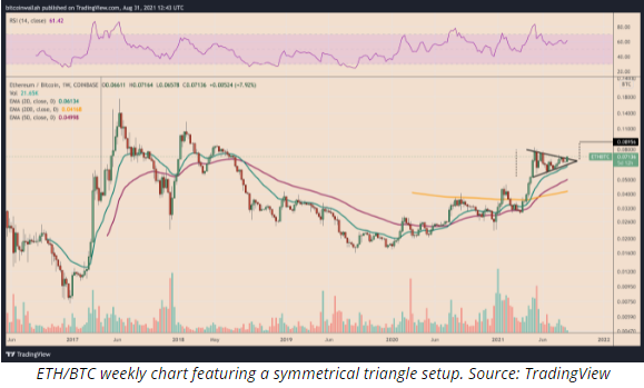 分析师将对称三角形视为趋势延续的指标——也就是说,在明显突破之后,他们通常将价格引向先前趋势的方向。因此,ETH/BTC价格在过去四个月在类似的三角形结构内波动后,可能会继续上行。