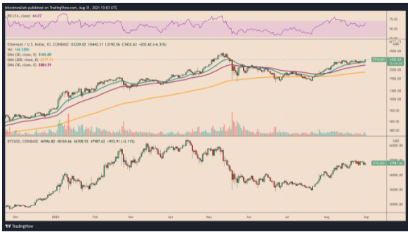 到2021年为止,以太币的表现远远超过了比特币,因为它在蓬勃发展的去中心化金融(DeFi)和不可替代代币(NFT)行业的逐步采用。截至8月31日,以太币今年迄今的利润为373%,比特币为63.55%。