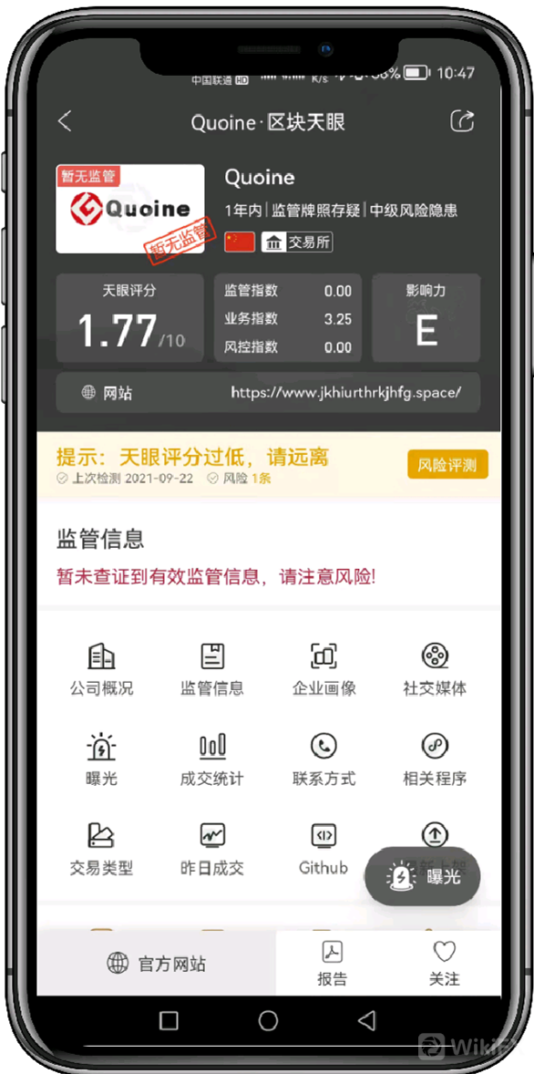 通过区块天眼APP查看就清楚了,评分仅1.77分的交易所,看来是不想混了,也开启“骗税”计划,明显是要跑路。碰到这样的交易所,要远离、要及时止损、要报警!