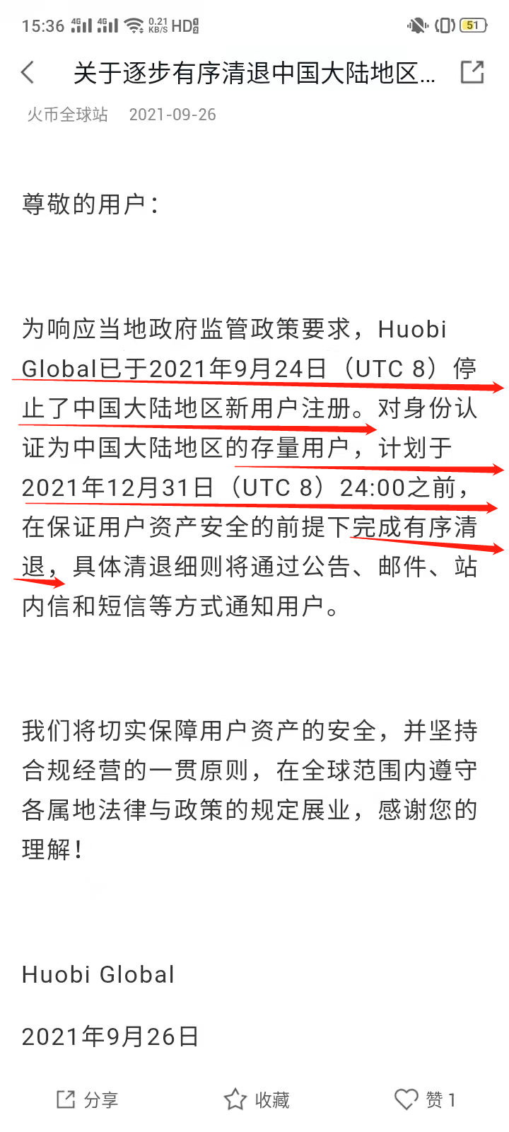 火币交易所已停止中国大陆地区新用户注册,并在9月26日发布“逐步清退中国大陆地区存量用户的公告”,承诺在2021年12月31日前完成对存量用户的清退。