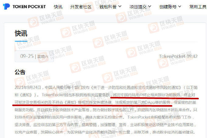 中文地区使用最广泛的去中心化钱包 TokenPocket 表示,积极拥抱相关监管条款,将对中国内陆用户终止相关部分功能服务、终止对可能涉及交易相关的及不符合《通知》等规范性文件或法律、法规规定的第三方DApp等的服务。