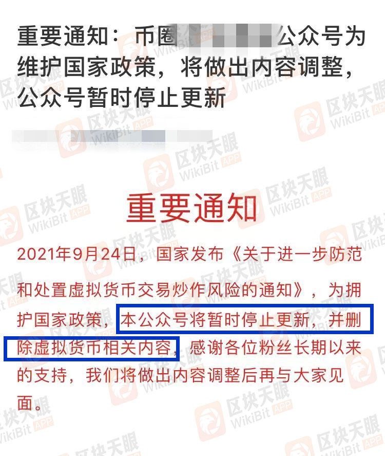 WikiBit 2021-09-26 17:30火币交易所已经正式发布通知,所有中国大陆用户将被清退!
