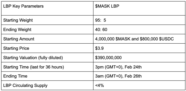 MASK LBP关键参数在LBP开始时,我们将投入400万枚MASK和80万枚USDC,起始价3.9美元/枚。详情请看下表: