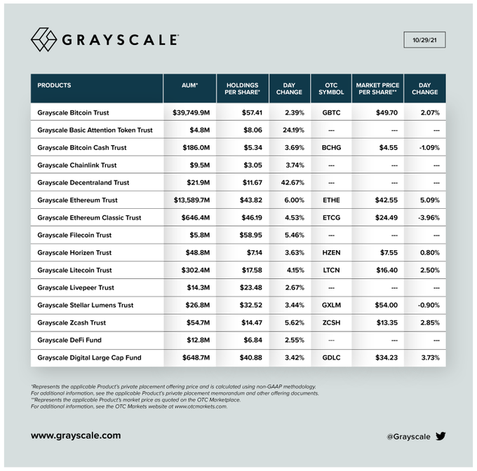 由上周五(10月29日)比特币、以太坊等加密资产再度持续反弹,使得灰度资管规模突破550亿美元至553亿美元。此外,灰度信托资产当日一级市场交易价格全线上涨,二级市场也是涨多跌少。