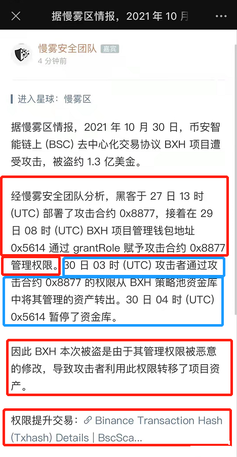 根据 BXH 官方审计机构的慢雾团队分析,因其管理权限被恶意修改,导致攻击者利用此权限转移了项目资产。