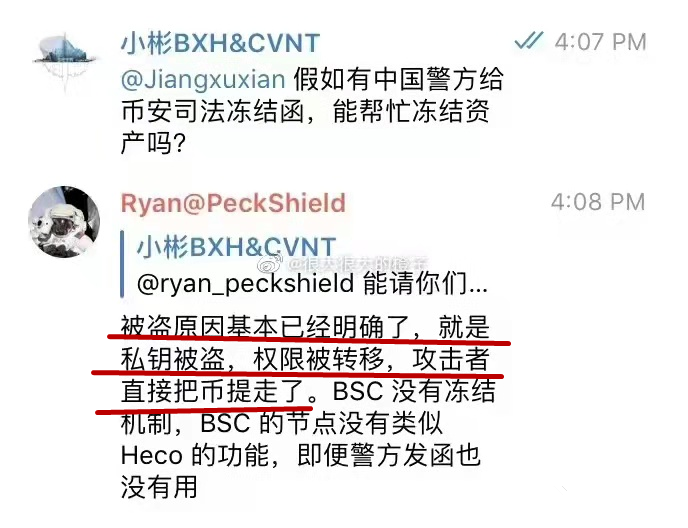 而该应用的主导者王小彬未公开表态,也没有表示会对此负责,只是在私下轻描淡写地表示:私钥泄露了,BSC没有冻结机制,即便警方发函也没有用。