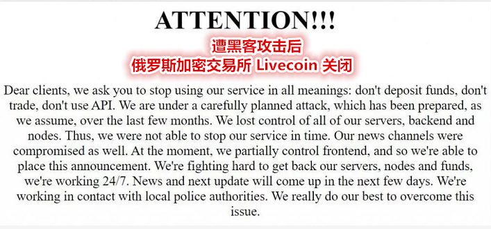 只要你身在币圈,那么无论是熊市还是牛市,交易所被黑客攻击后跑路的风险始终都存在。尤其是小交易所,一旦被盗无法兑付,结果可想而知。就像年初的俄罗斯加密交易所 Livecoin,遭黑客攻击后,直接宣布关闭。