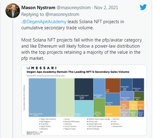 他还指出,截至 11 月 1 日,Solana 的 NFT 二级销售额在短短三个月内就达到了 5 亿美元。
