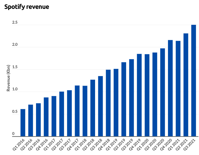 与此同时,随着时间的推移,Spotify的收入一直在稳步增长,这反映出基于NFT的音乐平台有很大的颠覆潜力。根据Spotify的2020年官方财报,该公司去年的收入为78.5亿欧元(合95亿美元),比2019年增长16%。Spotify的财务状况在2021年继续增长,2021年第三季度,月活跃用户总数同比增长19%,达到3.81亿。