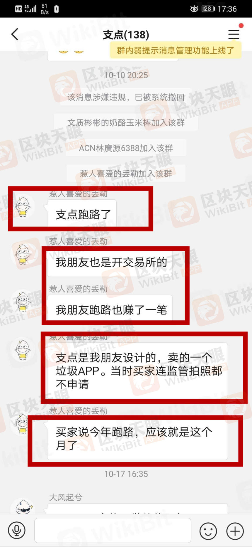 在没有得到更多清退消息的情况下,一句话就把用户打发了,还直接把群解散,不知道支点交易所在害怕什么?在逃避什么?而关于支点交易所的消息,好像从10月份就已陷入跑路风波。