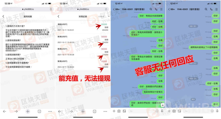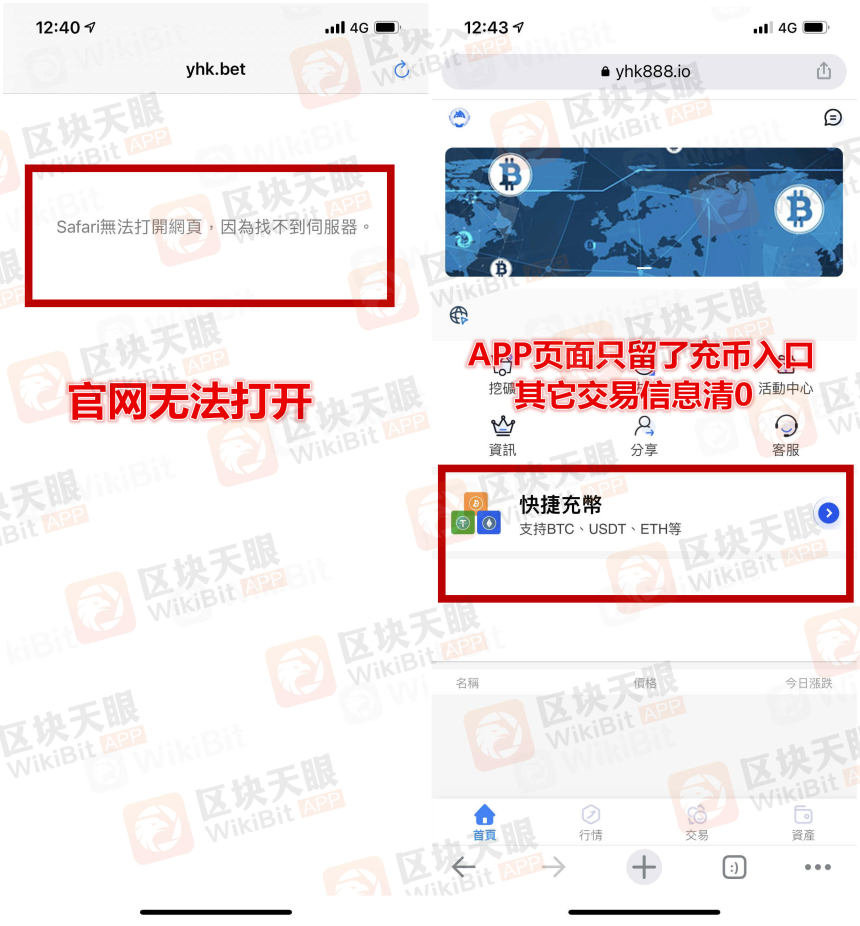 根据用户Q的曝光,目前yhk888交易所官网已无法打开,APP页面无任何交易信息,只留了一个充币入口。
