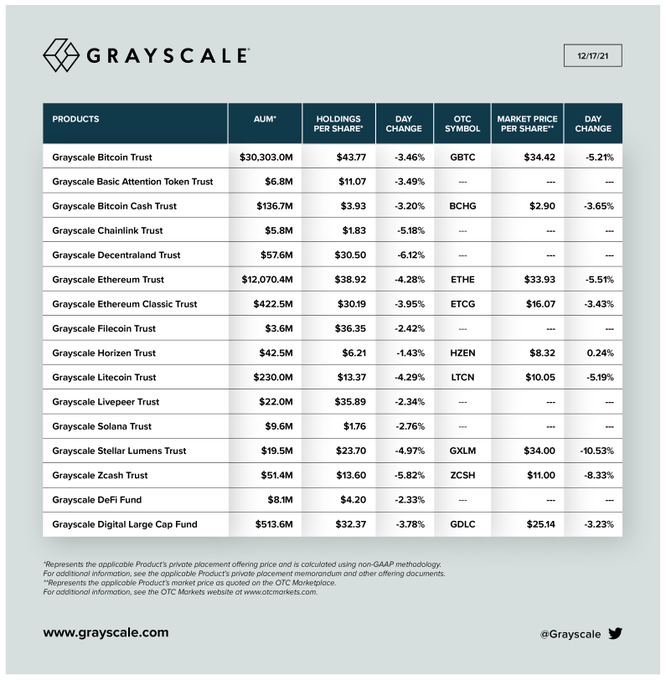 WikiBit 2021-12-20 15:43根据灰度官方推特Grayscale 12月18日公布的数据显示,截至12月17日灰度的总资产管理规模跌破440亿美元大关至439亿美元。