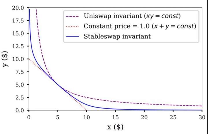 我们分析Curve在AMM模型上的创新之处。在图中(下图),坐标代表资产池中两种资产的比例,斜率反应当前的资产兑换比例即资产价格。可以直观的看出,xy=const是一条双曲线,随着x的变化斜率在不断的发生变化,如果要维持相对稳定的资产价格,则需要极深的流动性,现实操作难度很大。而在x+y=const曲线上,虽然曲线处处斜率相等,但可能面临一方资产消耗殆尽,即流动性枯竭的问题。