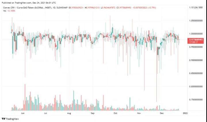 与此同时Convex协议本身允许cvxCRV流通,并通过本身的协议token CVX作为激励,建造了cvxCRV/CRV的流动性矿池,将其流动性大大改善,在SushiSwap上,cvxCRV与CRV可以近乎1:1的兑换。这一过程有些类似资产证券化,将本身低流动性的资产(veCRV)通过转换为高流动性的证券(cvxCRV),Convex在其中扮演了银行的作用。