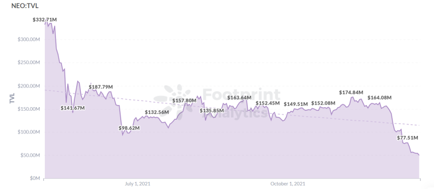 据 Footprint Analytics 的数据显示在整个行业向前发展的情况下,NEO 在最近 9 月进行升级和迁移,TVL 未见增长,反而呈现下降,截止 12 月 20 日 TVL 为 5043 万美元,对比 5 月 6 日的 TVL 增长率为 - 84%。对于 DeFi 市场或投资人来说,TVL 是生态发展及项目信任度的重要衡量指标,该值越大代表该链上的资金以及用户体量越大,项目集聚的资产越多。然而,NEO 的 TVL 呈下降趋势,与其经济模式和生态的发展息息相关。
