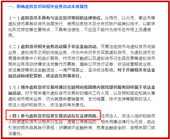 所以,对于国内币圈玩家来说,你可以持有虚拟货币这些网络虚拟财产,但是如果参与相关投资交易活动,这些民事法律行为则无效,也就是说,投资交易不受法律保护,其中产生的损失等后果自负!